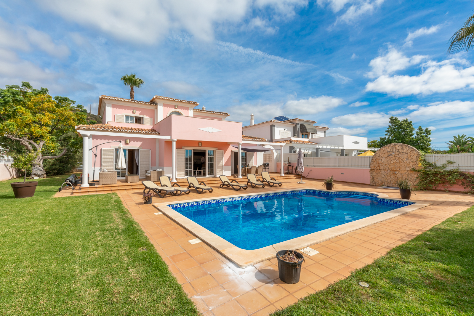This elegant south facing five bedroom villa is well located to the south of Loule, a short drive to all amenities, beautiful beaches and the resorts of Vale de Lobo and Villamoura.