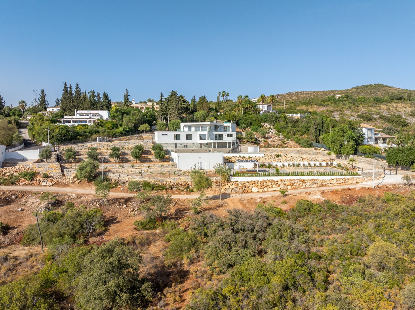On the first floor there are a further three ensuite bedrooms, one being the master bedroom with its own dressing room. All bathrooms have underfloor heating and the property has a heating and cooling system combined with individual Daiken air conditioning units. Each room accesses large South facing balconies with spectacular views of the valley and the distant coast. The grounds feature a large swimming pool and an enormous al fresco dining and leisure area, perfect for Summer parties or sundowners.